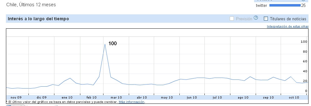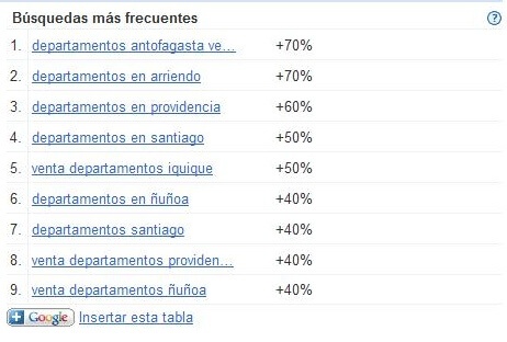 ¿Cómo interpretar estos datos? Por ejemplo el "+70%" al lado de palabra "departamentos en arriendo" significa que la popularidad de la palabra aumentó en un en un 70% en el período octubre 2009-octubre 2010 en comparación con el período anterior de 12 meses (es decir, octubre 2007-octubre 2008).