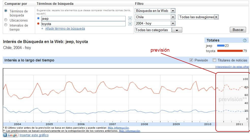 Otra funcionalidad muy interesante que ofrece Google es una previsión de las tendencias de búsqueda correspondientes a dichos términos. Considera estas previsiones sólo como estimaciones y no como previsiones exactas. Estas cifras se muestran como una línea discontinua en el gráfico.
