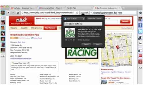 Así, todas las páginas visitadas por el usuario pueden ser compartidas en Twitter o Facebook, sólo haciendo clic en el botón "share" de la barra de herramientas.
