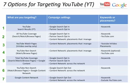De acuerdo a la información básica disponible sobre la plataforma, existe 7 formas básicas de traguetear Youtube desde Google Adwords.